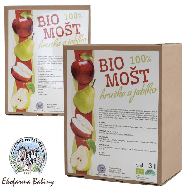Mošt je vyráběn postupem, který zaručuje uchování co nejvíce vlastností čerstvě vylisované šťávy. Příznačný je rovněž sediment na dně láhve, který je znakem přírodního charakteru nápoje. Před otevřením doporučujeme protřepat. Jablečno-hruškový mošt v biokvalitě z naší Ekofarmy Babiny. 100 % jablečno-hruškové chuti. Tradiční a stále jedinečný nápoj. Čistá přírodní šťáva z jablek. Nápoj není při výrobě ředěn ani filtrován.
