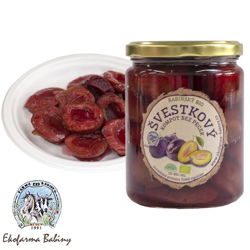 Složení: Vypeckované bio švestky a voda. Výživové údaje na 100 g: Energetická hodnota 1060 kJ/254 kcal, sacharidy 57 g z toho cukry 38 g, bílkoviny 2 g, tuky 0,4 g z toho nasycené mastné kyseliny 0,1g, vláknina 7g. Uchovávejte: 0-28°C. Po otevření ihned spotřebujte. Výrobce: Ekofarma Babiny, Homole u Panny, Česká Republika.