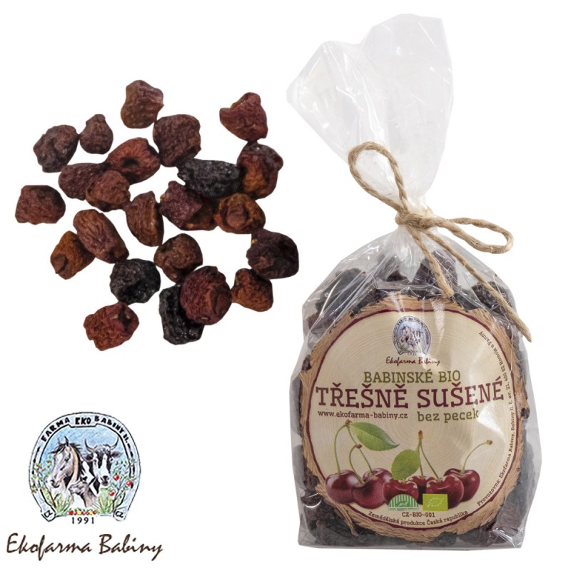BIO třešně 100 g z naší ekofarmy, jsou lahodné, bez konzervačních látek a usušeny šetrným způsobem.